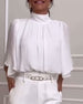 SPECIFICATIES Toptype: Bloes Stijl: Elegant,Bedrijf Materiaal: katoenblends Gelegenheid: Dagelijks,Werk Hals lijn: Hoge kraag Patroon type: Effen kleur Mouw type: vlinder mouw Mouw lengte: 3/4 mouw Pasvorm: Normaal Seizoen: Lente,Zomer,Val Details: gerimpeld Pakket bestaat uit: 1 x bloes MAATTABEL (cm) Maat Borst Lengte S 97 65 M 101 66....