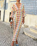 SPECIFICATIES Stijl: Vakantie,Elegant Materiaal: katoenblends Type jurk: A-lijn Jurk lengte: Maxi Hals lijn: V-hals_V Patroon type: Geometrische print Mouw type: Lantaarn mouw Mouw lengte: 3/4 mouw Details: Lapwerk,Rugloos Pasvorm: Loszittend Seizoen: Lente,Zomer,Val Gelegenheid: Dagelijks,Vakantie Pakket bestaat uit: 1 x Jurk MAATTABEL (cm) ...