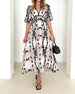 SPECIFICATIES Stijl: Elegant Materiaal: katoenblends Type jurk: A-lijn Jurk lengte: Maxi Hals lijn: V-hals_V Patroon type: Afdrukken Mouw type: Pofmouw Mouw lengte: Halve mouw Details: Lapwerk Pasvorm: Normaal Seizoen: Lente, Zomer, Val Gelegenheid: Dagelijks Pakket bestaat uit: 1 x Jurk MAATTABEL (cm) Maat Borst Lengte S...