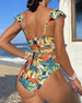 SPECIFICATIES Stijl: Vakantie Materiaal: 15% Spandex, 85% Polyester Gelegenheid: Vakantie Hals lijn: V-hals_V Patroon type: Bladeren Mouw lengte: Mouwloos Top type: Bikini BH-type: Draadloze BH Bodem type: Hoge snede Pasvorm: mager Seizoen: Zomer Details: Rugloos, Ruche Pakket bestaat uit: 1 x Bikini MAATTABEL (cm) Maat Lengte ...