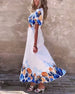 SPECIFICATIES Stijl: Gewoontjes Materiaal: katoenblends Type jurk: A-lijn Jurk lengte: Maxi Hals lijn: V-hals_V Patroon type: Afdrukken Mouw type: Pofmouw Mouw lengte: Korte mouw Pasvorm: Normaal Seizoen: Lente, Zomer Gelegenheid: Dagelijks Pakket bestaat uit: 1 x Jurk MAATTABEL (cm) Maat Borst Lengte S 95 137 M 100 138.5 L 105 14...