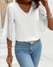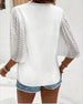 SPECIFICATIES Toptype: Bloes Stijl: Gewoontjes Materiaal: katoenblends Gelegenheid: Dagelijks Hals lijn: V-hals_V Patroon type: Effen kleur Mouw type: Flare mouw Mouw lengte: 3/4 mouw Pasvorm: Normaal Seizoen: Lente,Zomer Details: Doorzichtig Pakket bestaat uit: 1 x bloes MAATTABEL (cm) Maat Borst Lengte S 97 65 M 101 66.5 L 105 68 X...
