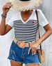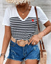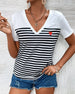 SPECIFICATIES Toptype: t-shirt Stijl: Gewoontjes Materiaal: katoenblends Gelegenheid: Dagelijks Hals lijn: V-hals_V Patroon type: Gestreept,Afdrukken Mouw type: Normale mouw Mouw lengte: Korte mouw Pasvorm: Normaal Seizoen: Lente,Zomer Pakket bestaat uit: 1 x T-shirt MAATTABEL (cm) Maat Borst Lengte S 97 65 M 101 66.5 L 105 68 XL 111...