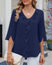 SPECIFICATIES Toptype: Bloes Stijl: Gewoontjes Materiaal: katoenblends Gelegenheid: Dagelijks Hals lijn: V-hals_V Patroon type: Effen kleur Mouw type: Mouwen met split Mouw lengte: Halve mouw Pasvorm: Normaal Seizoen: Lente,Zomer Details: Ruche Pakket bestaat uit: 1 x bloes MAATTABEL (cm) Maat Borst Lengte S 100 68 M 105 69 L 110 ...