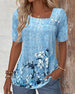 Losvallende patchworkjurk met V-hals en klokmouwen met print