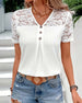 SPECIFICATIES Toptype: Bloes Stijl: Gewoontjes Materiaal: katoenblends Gelegenheid: Dagelijks Hals lijn: V-hals_V Patroon type: Effen kleur Mouw type: Normale mouw Mouw lengte: Korte mouw Pasvorm: Normaal Seizoen: Lente,Zomer Details: Lapwerk,Uithollen,Veter Pakket bestaat uit: 1 x bloes MAATTABEL (cm) Maat Borst Lengte S 97 65 M 101 66....