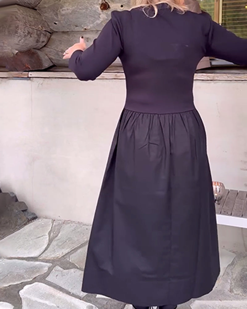 Mode effen kleur heup-omwikkelde jurk met ronde hals en lange mouw