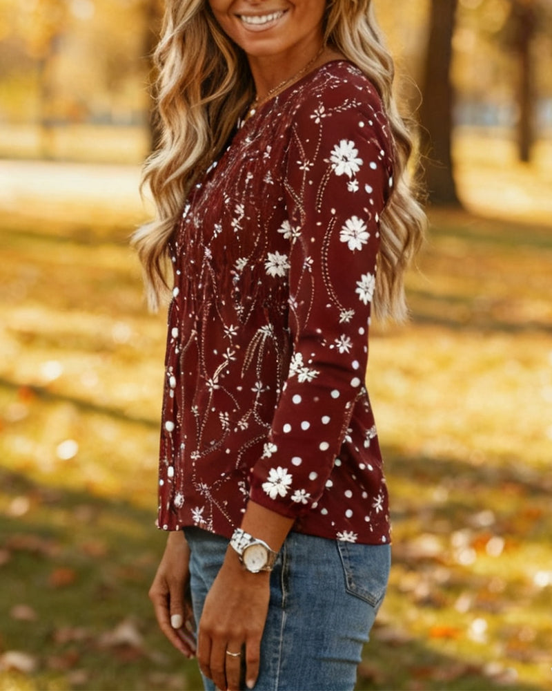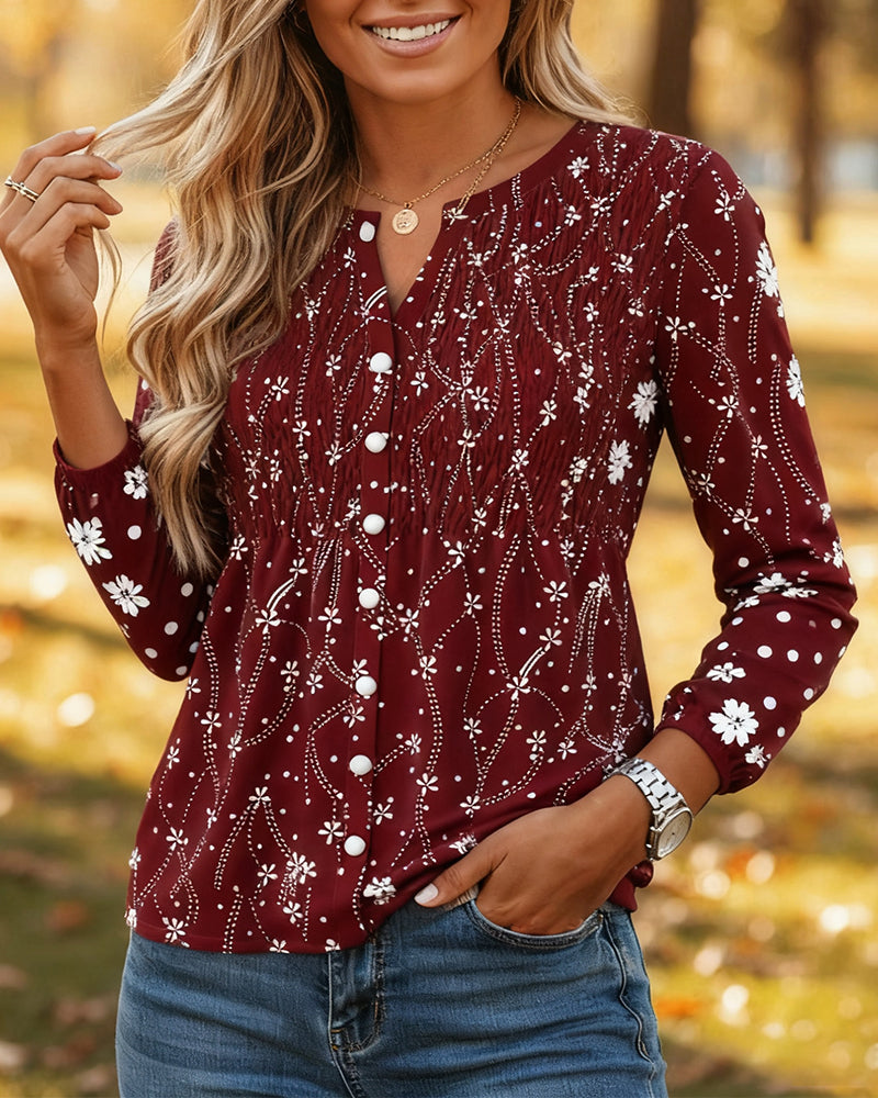 Gedrukte Casual Top Met V-Hals En Lange Mouwen