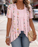 SPECIFICATIES Toptype: Bloes Stijl: Gewoontjes Materiaal: katoenblends Gelegenheid: Dagelijks Hals lijn: Ronde nek Patroon type: Bloemen Mouw type: Normale mouw Mouw lengte: Korte mouw Pasvorm: Normaal Seizoen: Lente,Zomer Details: Twee valse stukken Pakket bestaat uit: 1 x bloes MAATTABEL (cm) Maat Borst Lengte S 97 65 M 101 66.5 L 10...